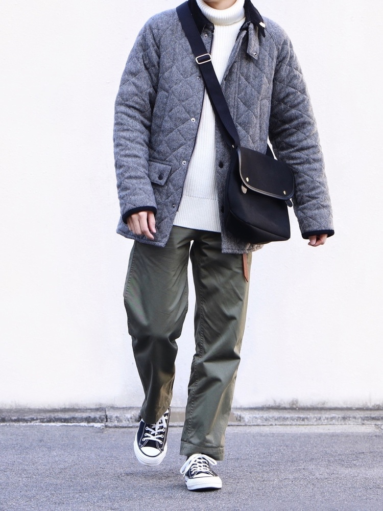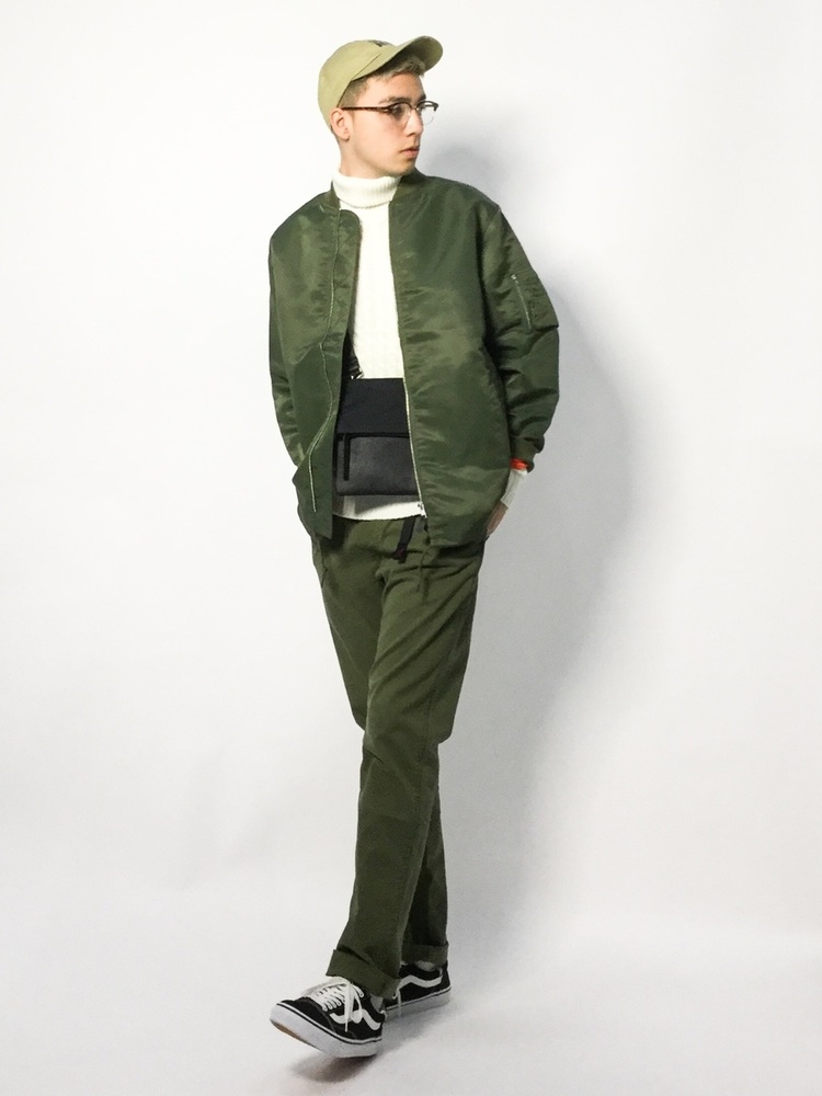 アウターとボトムスの両方をカーキで統一した、ワンランク上のメンズコーデです。品のある白のタートルネックで、キャップやMA-1のスポーティさを緩和。足元はバッグとリンクさせた黒で、カーキのワントーンコーデを引き締めています。