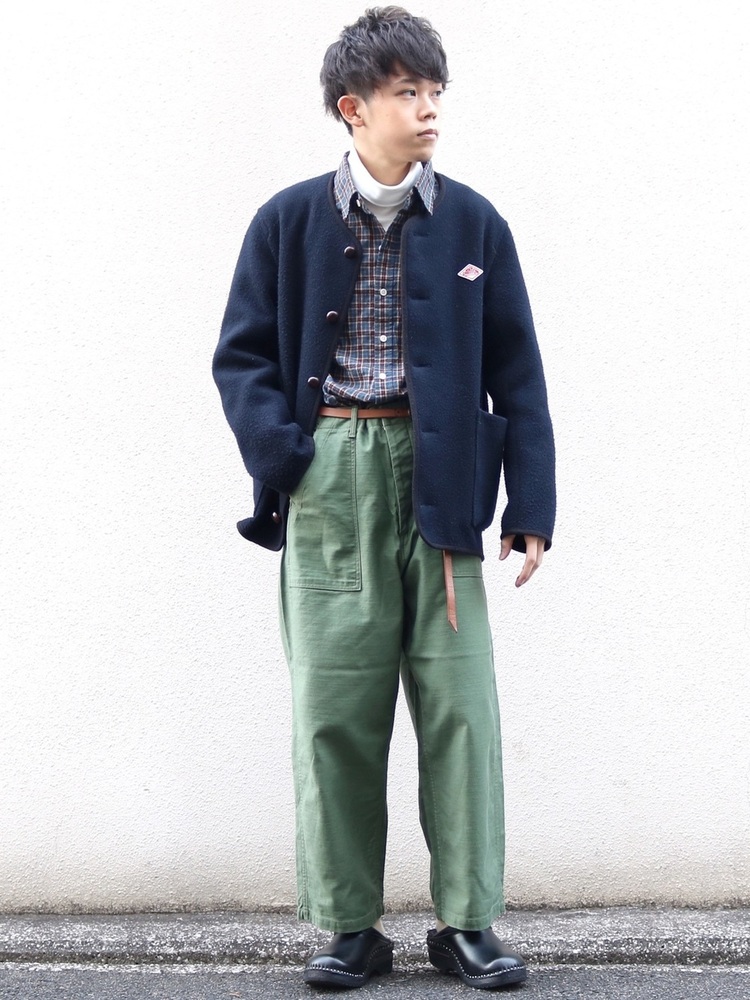 カーキと相性のいいネイビーのジャケットを合わせた、カジュアルコーデです。ゆったりとした肉厚な生地のワイドベイカーパンツにチェック柄シャツをタックインすることで、シルエットが野暮ったくなることを回避。インナーの白タートルネックがクリーンさを引き立てます。