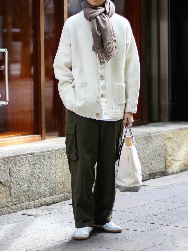 ミリタリー系アイテムであるワイドなカーゴパンツに、白やベージュアイテムを合わせた清潔感溢れるメンズコーデです。ざっくりとしたニットカーディガンとマフラーが、ほっこりとした温かみのある着こなしを演出。落ち着いたトーンのカーキパンツが、コーデを引き締めています。