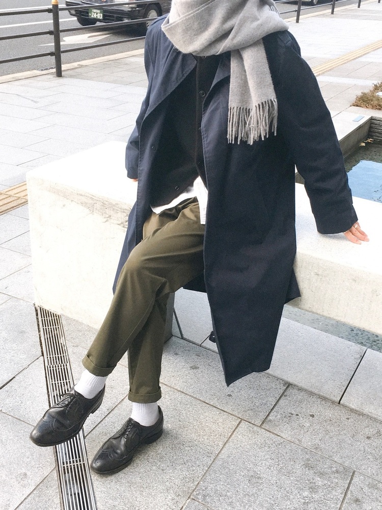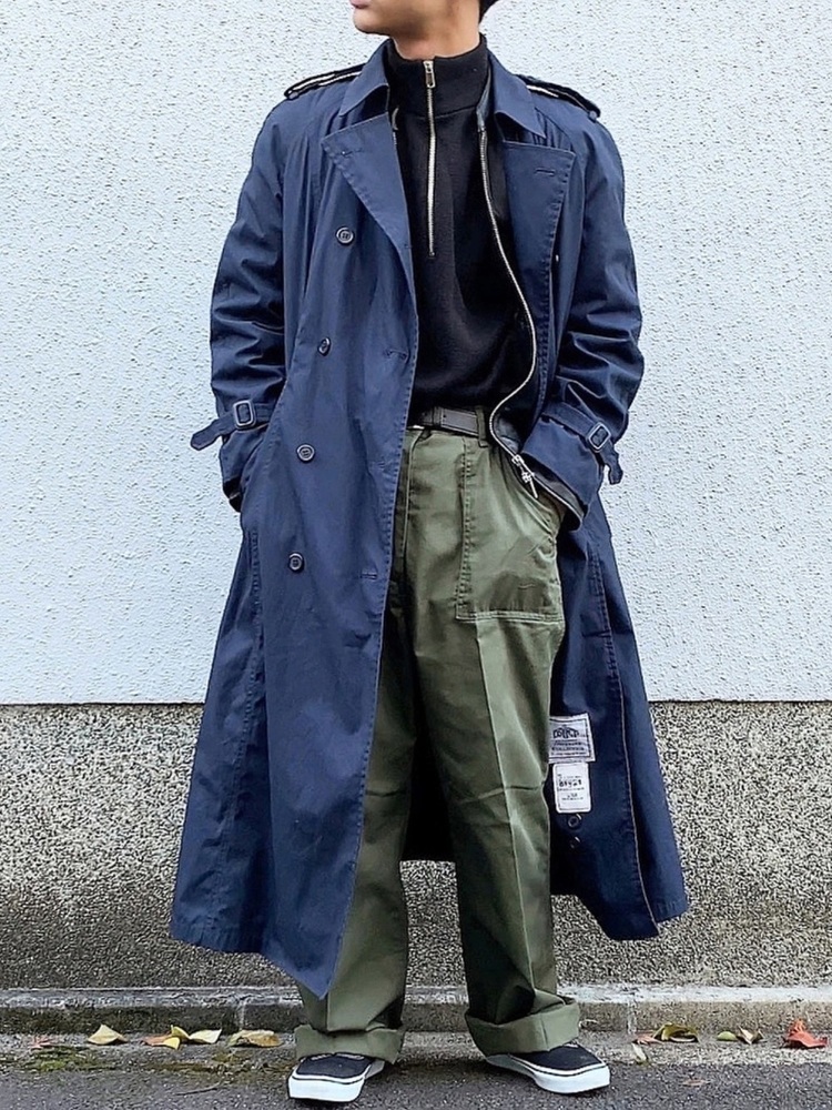 ロングトレンチコートにカーゴパンツを合わせた、大人ミリタリーコーデです。ネイビーとカーキの配色は、着こなしを品良く見せたいときに最適です。足元がルーズになりすぎないバランス感で、パンツの裾を折るアレンジを加えているポイントも参考になります。