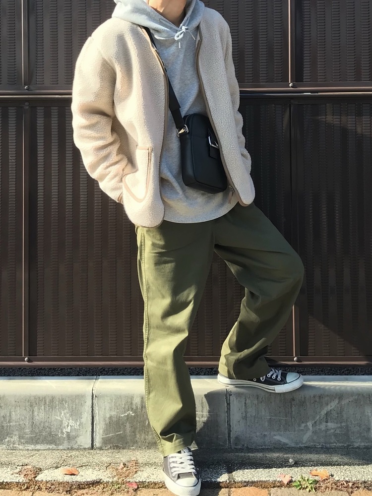 フリース素材のカーディガンとパーカーに、太めのチノパンを組み合わせれば気取らないゆるカジコーデに。ライトグレーと白を上半身に持ってくることで、ゆるカジコーデの中にも清潔感がある印象にまとめています。