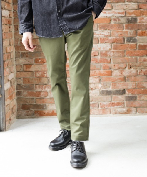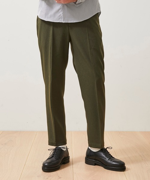 ストレッチ性がありシワになりにくい、温かみのある秋冬向けの素材を使用したカーキパンツです。スタイルをよく見せてくれる、太もも周りから裾にかけてテーパードがかかったシルエットが特徴。ヒップ周りにゆとりがありウエスト部分はゴムシャーリングになっているため、窮屈にならず履き心地も快適です。