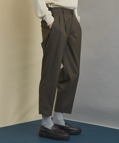 ワイドシルエットのカーキパンツでも、野暮ったい印象にならない1本を探している人におすすめのアイテムです。ゆるい印象のサイズ感ですが、しっかり腰から裾にかけてテーパードがかかっていることがポイント。また、アンクル丈なのでブーツやハイカットスニーカーなどにも合わせやすくなっています。