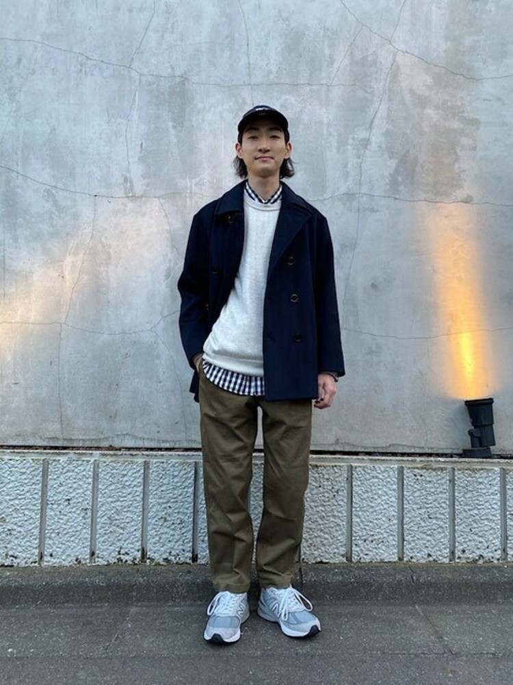 上品なPコートを、カーキのシェフパンツとキャップでカジュアルダウンさせたメンズコーデです。ギンガムチェックシャツは白ニットと重ね着し、旬のトラッド感をプラス。足元はライトグレーのスニーカーをチョイスして、軽やかなムードに仕上げていることもこなれた雰囲気を作るコツです。