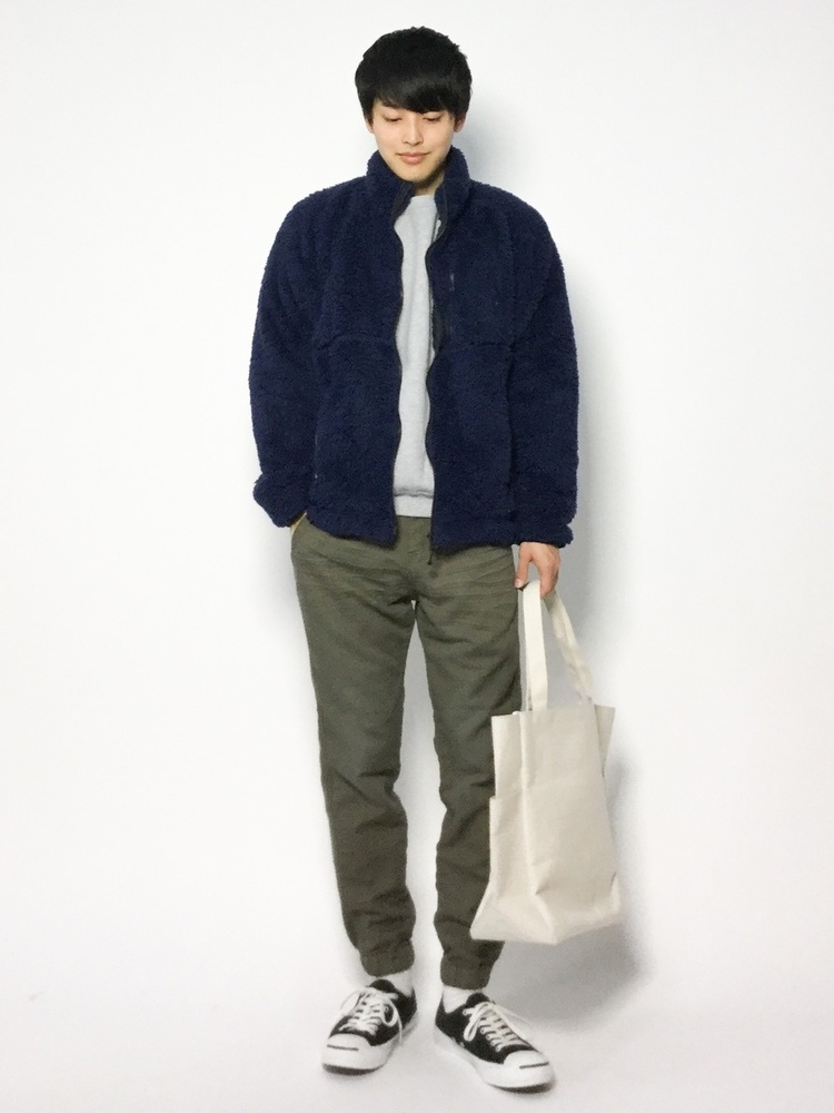 裾が絞られたカーキのリラックスパンツで、ゆるカジにスポーティさをミックスしたコーデです。トートバッグやソックスは白をチョイスし、冬でも重たくならないよう全体的に爽やかな配色に。冬のトレンドアイテムあるボア素材ジャケットが、着こなしにこなれ感を高めています。