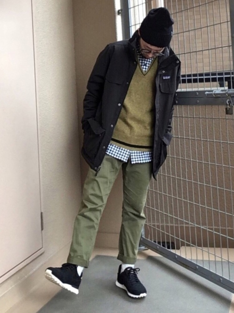 マウンテンパーカーとカーキパンツだけだとラフなコーデになりますが、ニットベストとギンガムチェックシャツを合わせることで、ラフさが和らぎ品も感じられるカジュアルコーデに。シャツはレイヤードさせ、きっちり着すぎないことがぬけ感を出すコツです。