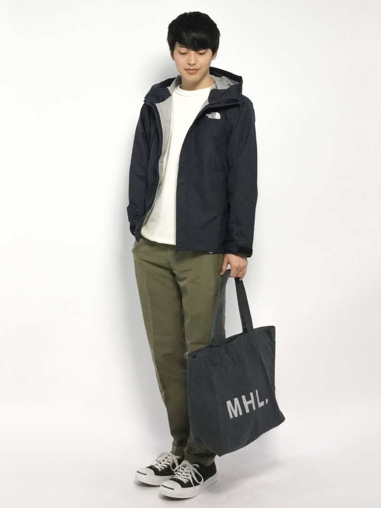 マウンテンパーカーにテーパードがかかったカーキパンツを合わせた、スポーティなメンズコーデです。シルエット全体を細身にまとめることで、スタイルアップを叶えています。また、トップスの白ニットで白の割合をコーデの中で増やし、重たく見せないよう工夫していることもポイントです。