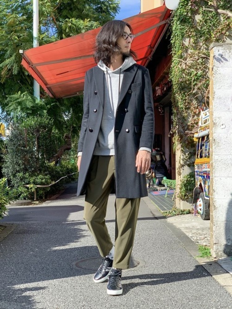 ワイドパンツ×パーカー×ステンカラーコート