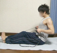 足裏にチューブをかけて手に持った時には、膝の位置に手がくるように長さを調節しましょう。足を伸ばした状態で手を伸ばすとだいたい膝の位置に手がきます。この状態から10回~20回を2〜3セットすることから始めてみましょう。