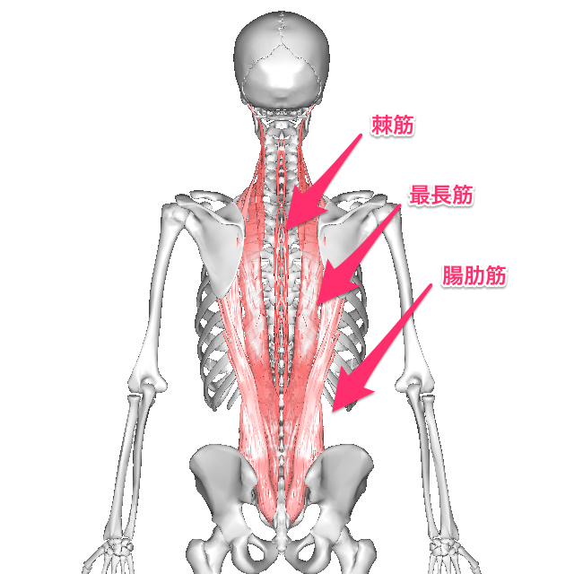 脊柱起立筋は首の後ろから腰まで伸びている長い筋肉で、棘筋・最長筋・腸助筋の3つの筋肉から成っています。この3つの筋肉はそれぞれ別の筋肉ですが、運動をする時には連動して1つの筋肉のような働きをすることからまとめて脊柱起立筋と呼ばれています。