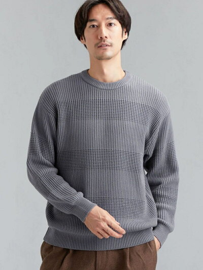 コットンとアクリルを使用したニットです。カラーを変えたボーダーではなく編み方でボーダーを作っている大人っぽいアイテム。光の陰影を楽しみながらきれいめのコーデを作り出すことができます。