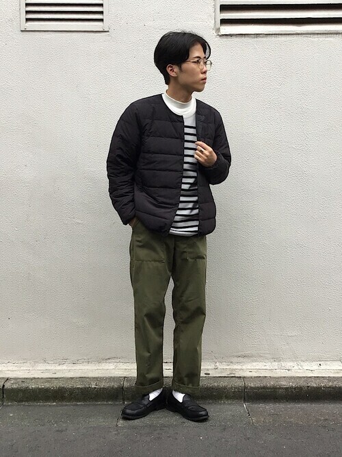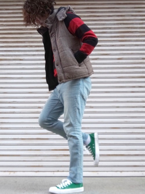 赤×黒のボーダーニットは色の鮮やかさが視線に訴えるので強い印象を作り出します。こちらのコーデではダウンベストをアウターに着用することで緩和。シューズの緑色など使っている色は多いですが、アウターとパンツのトーンが同じなので統一感が出ているおしゃれな着こなしです。