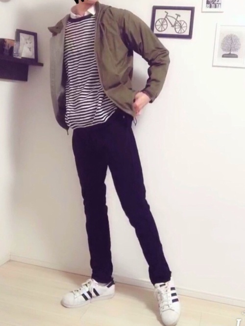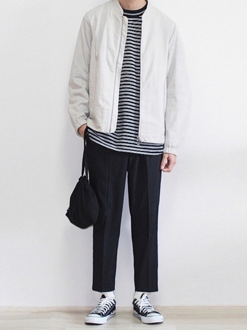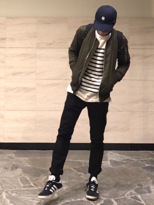 人気のMA-1ジャケットとボーダーセーターは相性が良いアイテムです。こちらのように細身のパンツと合わせればバランスも良くおしゃれな印象を簡単に作り出すことも可能です。