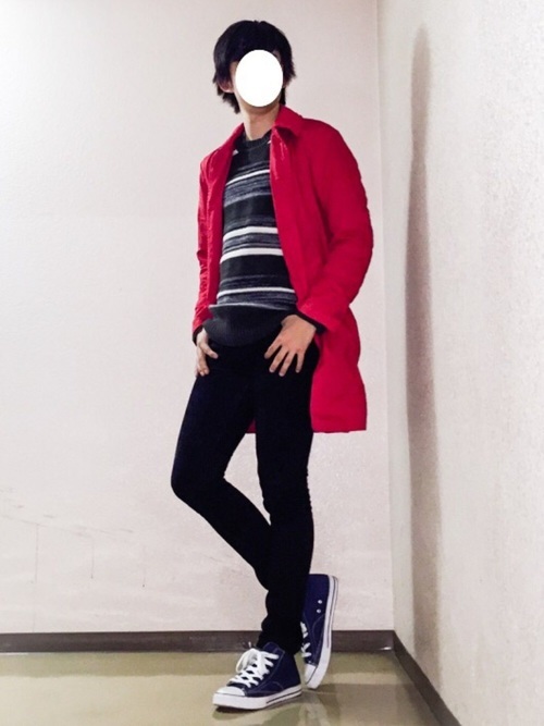 カーキのボーダーニットに赤のコートを合わせた一見派手な着こなし。ですが、明るいカラーを足すことで暖かい春の印象を作ることができます。足下はスニーカーでカジュアルダウン。レジャーシーンにぴったりな着こなしです。