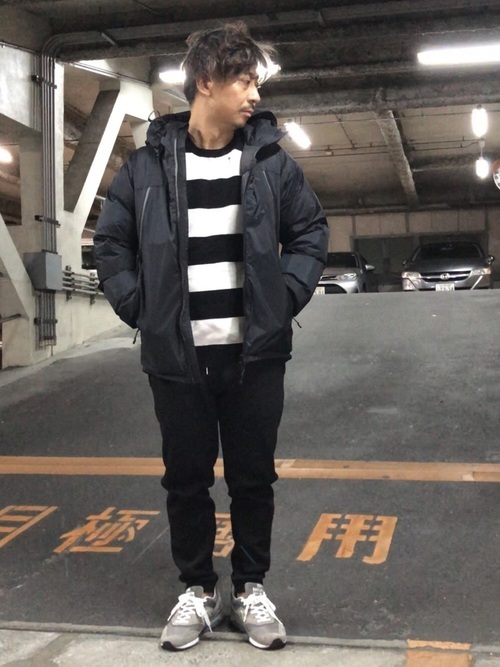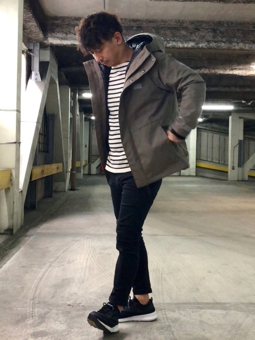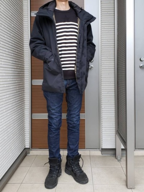 冬らしいアウターを使ったワントーンの着こなしです。単体で着用するとインパクトの大きな白×黒のボーダーでも、こちらのようにほかのアイテムと合わせることで調和し浮かなくなります。男性らしく、かっこいいメンズコーデです。