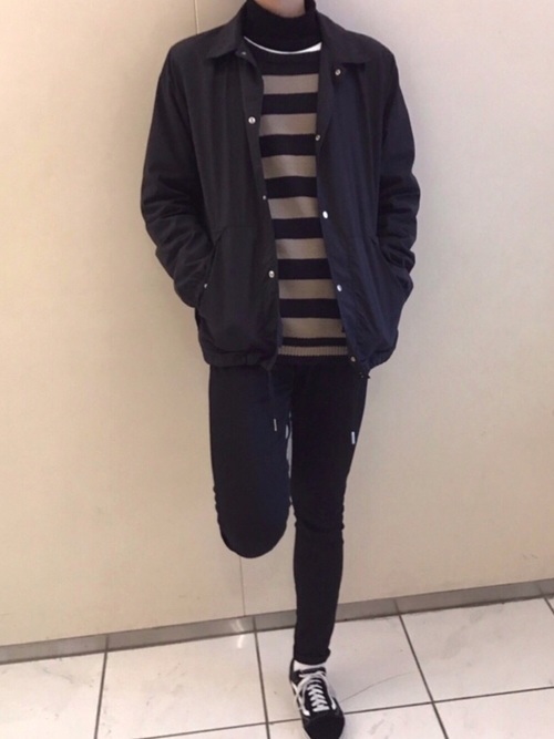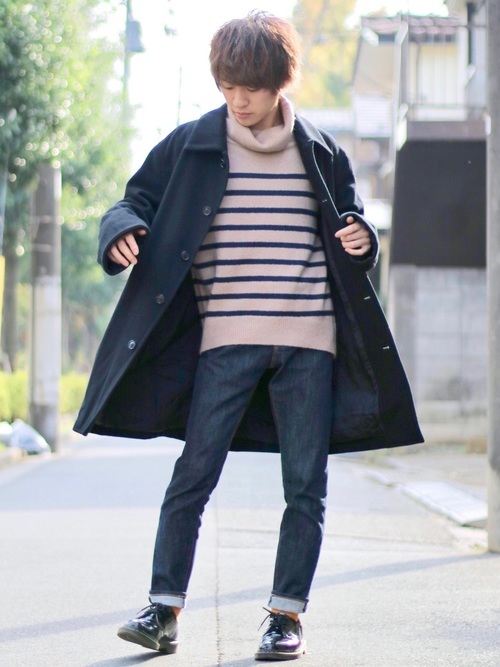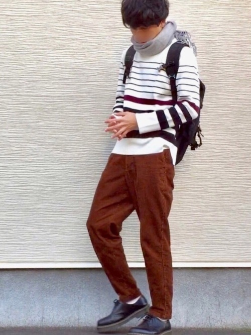 タートルネックのボーダーニットを細身のパンツと合わせた着こなしです。こちらは全体を暗いトーンで揃えた着こなしで、冬の雰囲気が出ています。