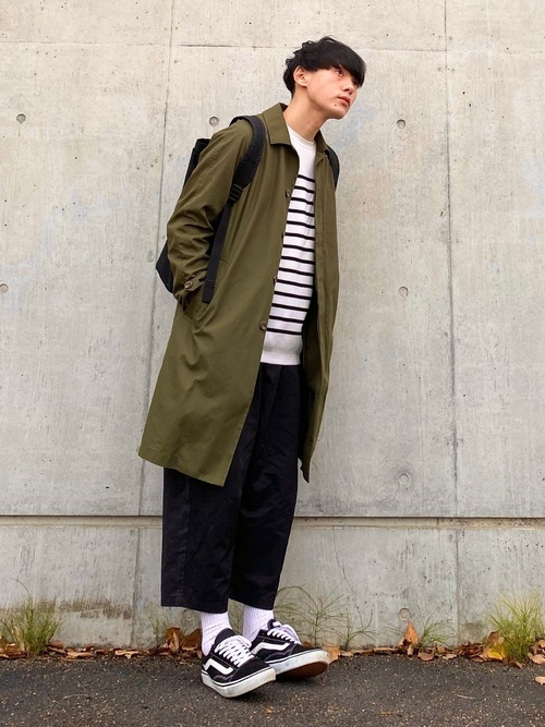 ボーダーニットとアンクル丈のパンツを合わせたメンズコーデです。カジュアルに寄り過ぎないようにアウターはステンカラーコートで大人っぽく。バランス感覚に優れたおしゃれ上級者の着こなしです。