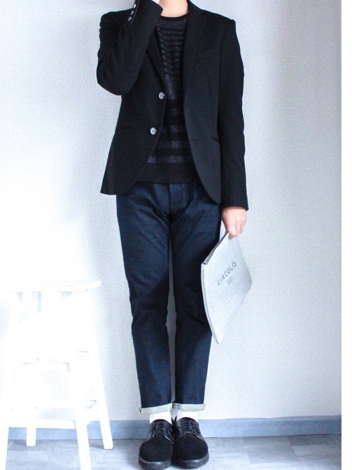 オフィスカジュアルにも流用できそうな、ニット×ジャケットの着こなしです。秋らしくフェルト生地が温かい印象のスリッポンを着用。カジュアルな雰囲気を作り出しています。