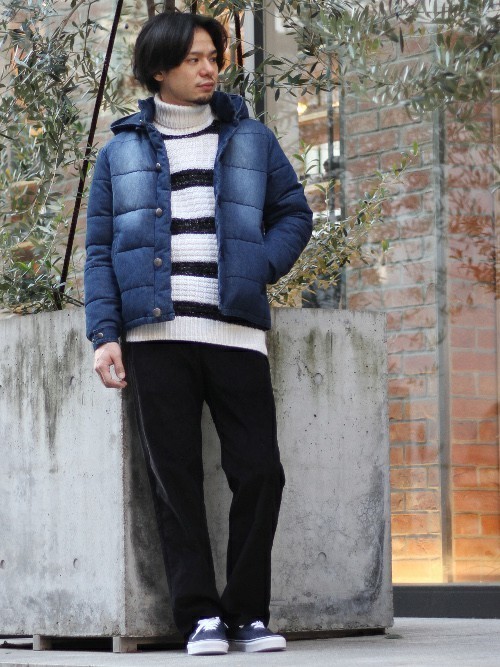 ボトムスはデニム、スラックス、チノとどのようなものでも相性が良いでしょう。しかしトップスにボリュームがあるのでボトムスは細身にするとバランスを取りやすくなります。