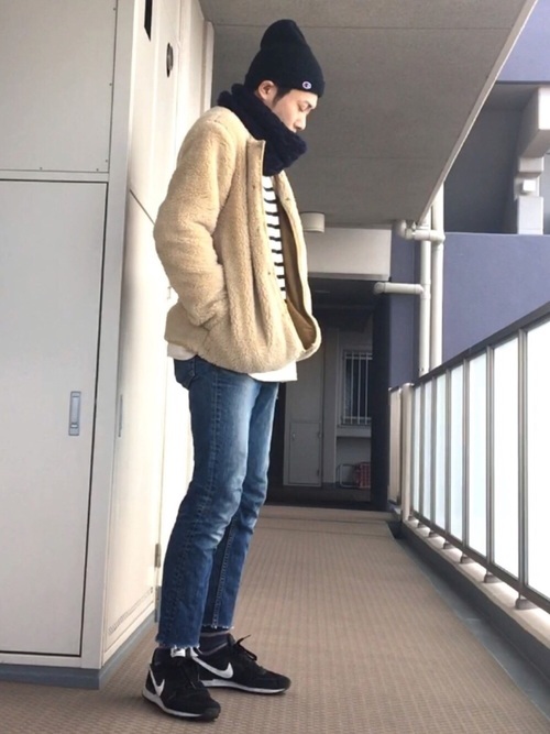 トレンドのもこもこアウターは女子ウケもよく暖かな雰囲気が出ます。トップスにボリュームがある分、ボトムスは細身をセレクトしてバランスをとったおしゃれなメンズコーデです。