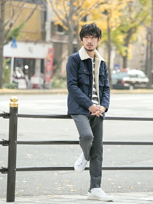 トレンド感あるボアジャケットをボーダーセーターと合わせたきこなしです。インナーに使うセーターはもこもこしないようにハイゲージをセレクト。パンツはニットの色と合わせてグレーでシックにまとめています。
