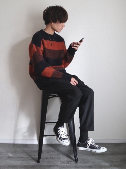 暖かい暖色のボーダーニットは秋から冬にかけて2シーズンにわたり大活躍のアイテムです。こちらはワイドテーパードアンクルパンツト合わせたトレンド感ある着こなし。足下はスニーカーですが、きれいめに仕上げたいときは革靴でも違和感ありません。