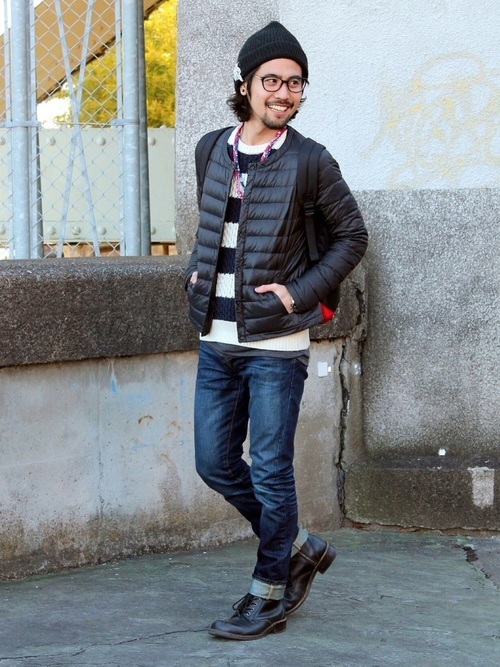インナーダウンをアウターとして着用した着こなしです。バッグやニット帽、チョーカーなどの小物使いがおしゃれでトレンド感ある着こなし。デニムは足下をロールアップすることで軽やかな印象になります。