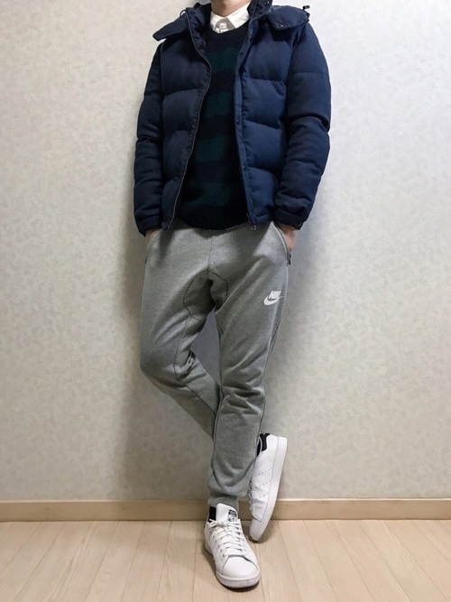 ネイビーのセーターに白のシャツ襟をチラ見せしたきちんと感ある着こなしです。ボトムスにスウェットパンツ、足下にスニーカーとスポーツカジュアルを意識した着こなしはトレンド感満載です。