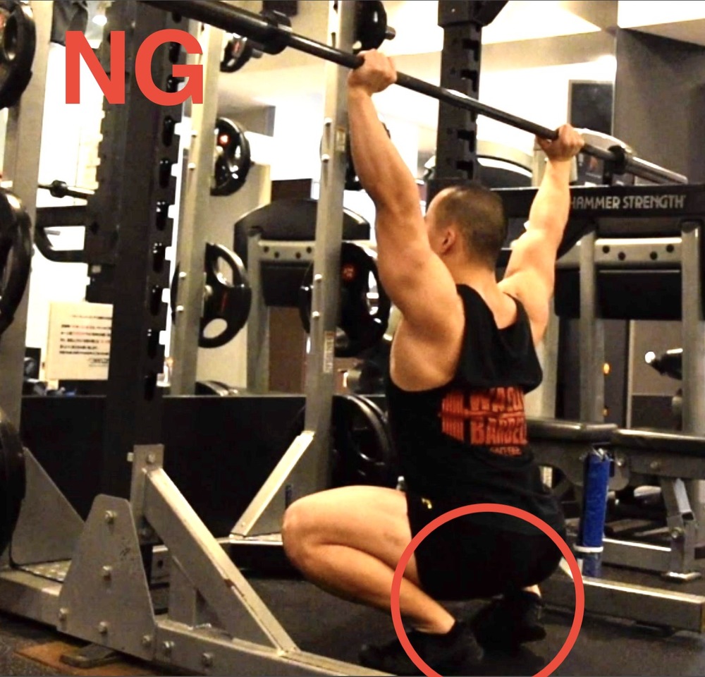 オーバーヘッドスクワットを行う際には、かかとが浮かないよう注意してください。上の画像のようにかかとが浮いた状態ではバランスが取りにくく、正確なフォームで動作を行いづらくなってしまいます。