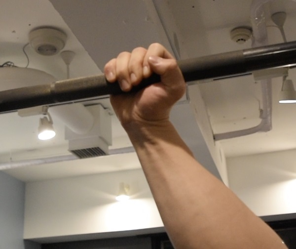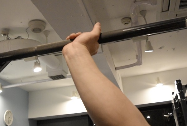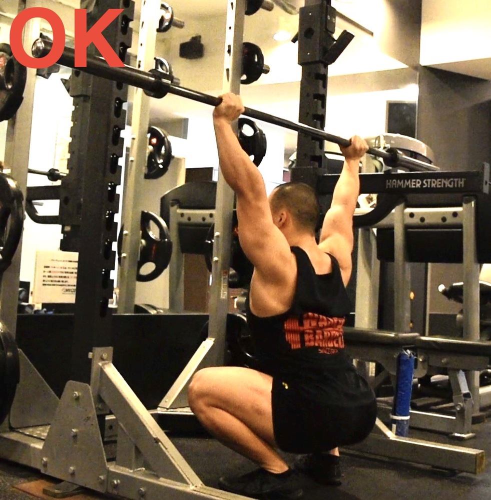 オーバーヘッドスクワットではバーベルの握り方にも注意しなければなりません。上の画像のように手のひらでバーベルを握っていると、手首を痛めてしまう恐れがあります。