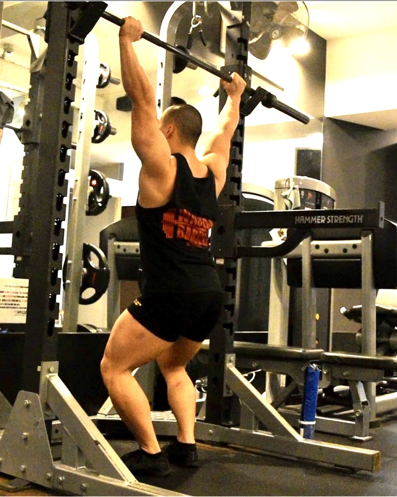 続いて、腕を上げてバーベルを後ろから頭上に掲げます。このとき、バーベルを骨で支えられる姿勢(ゼロポジション)をしっかりと取れるよう意識してみてください。