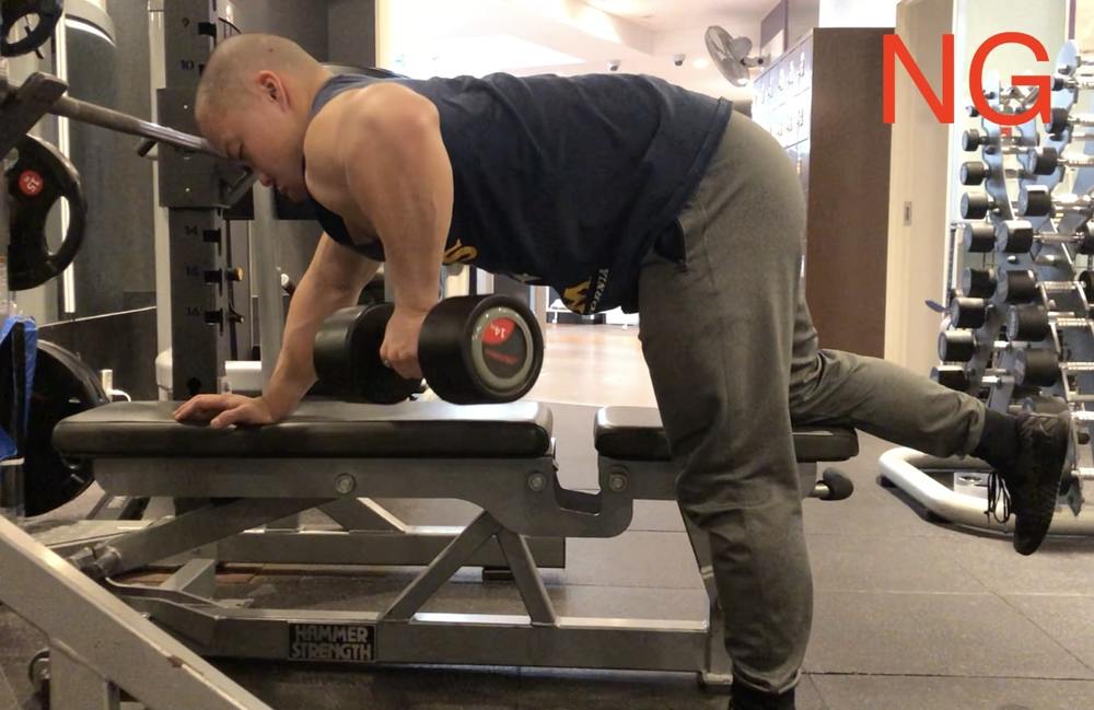 まずは、ダンベルを片手で握ります。そのまま画像のように片手・片膝をベンチに置き、身体の半分のみが四つん這いになる姿勢を取りましょう。このときに顎は上げず、身体は頭からお尻までまっすぐの状態を保ってください。両肩と骨盤が四角形を作るよう意識して、その四角形が傾かず地面と平行になるようキープするのがポイントです。