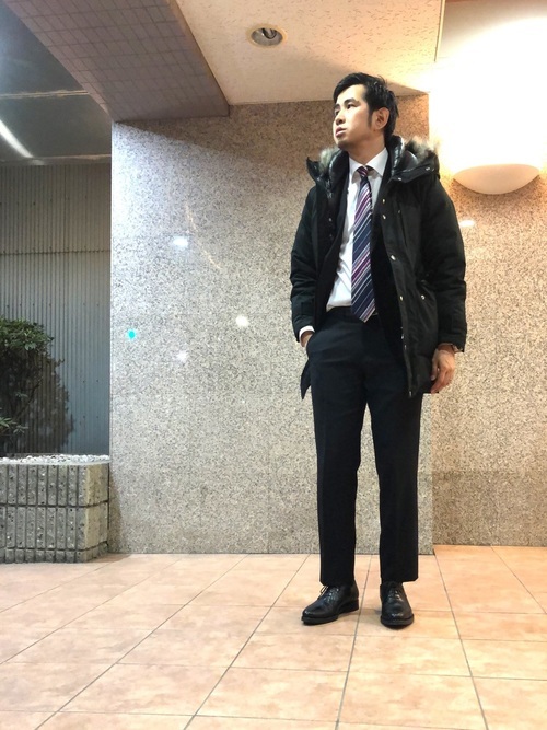 こちらは、ブルー系のスーツに明るいブルーのネクタイをあわせ、そこに黒のロング丈のダウンジャケットを合わせたコーディネートです。スーツがブルー系で爽やかな印象ですが、そこに黒のダウンジャケットを合わせることで引き締まった印象を与えることができます。