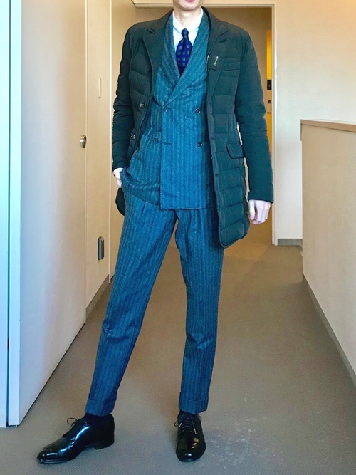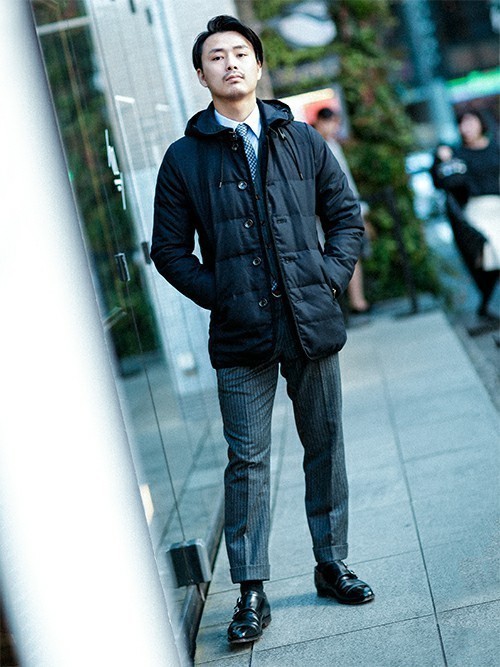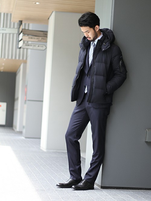 こちらは、グレー系のスーツにすっきりとした細身シルエットのダウンジャケットを合わせたコーディネートです。ダウンジャケットは、東京西川とナノユニバースがコラボしたアイテムで、暖かさを保ちつつ、ここまで細身のシルエットを実現しています。膨らみ過ぎないすっきりとした印象で、ビジネスにピッタリです。