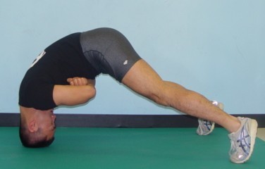 リバースレスラーブリッジは床やマットなどに膝と額をつけ、額から頭頂部へと動かしていくトレーニングです。胸鎖乳突筋、僧帽筋の上部に負荷を掛けられる効果があるので、首を太くするには重要な筋トレです。