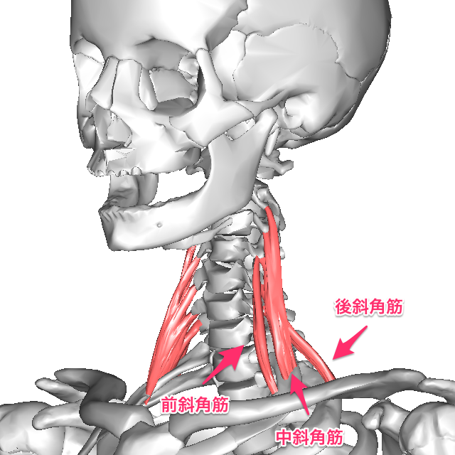 斜角筋は僧帽筋と胸鎖乳突筋に挟まれている筋肉で、首を前後左右に曲げる役割を担っている重要な筋肉です。
