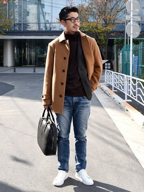 Pコート×ツイードジャケット×タートルネックニット×デニムパンツ