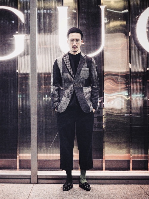 黒のスウェットにパンツ、ツイードジャケットを合わせたジャケパンスタイルもおしゃれ。上下黒のワントーンで仕上げた着こなしに、ブロックチェックのパッチワークデザインのツイードジャケットを羽織れば、こなれ感がUPします。足元のソックスも左右のカラーが違ったものをあえて合わせるなど、遊び心をプラスしています。