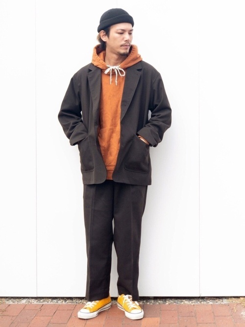 オレンジカラーのパーカーをインナーにすることで、カジュアル感とイマドキ感のある印象に。ジャケットならノーカラーのものでなくてもパーカー合わせがスッキリとまとまりますね。イエローのスニーカーを投入してさらにアクセントを加えるのもいいです。