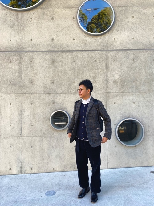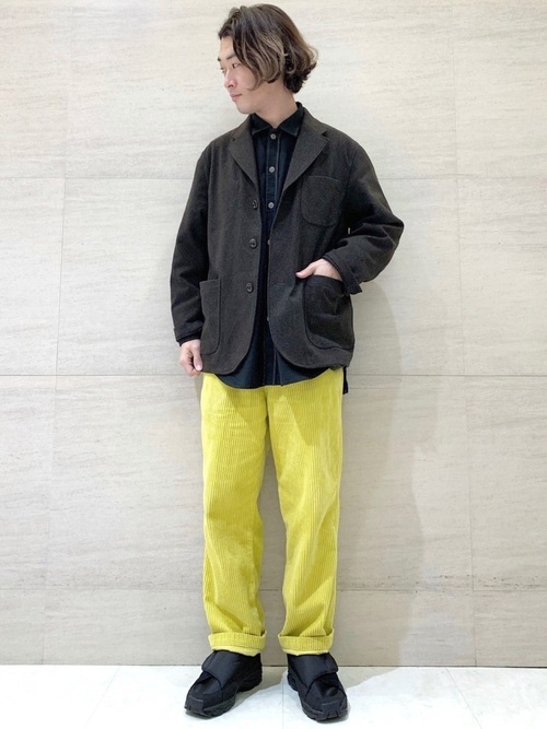 ツイードジャケットに、シャツジャケット×コーデュロイパンツを合わせた着こなしも程よい。上半身をダークなテイストでまとめ、ボトムスに明るいイエローカラーを加えて華やかさをプラスしています。