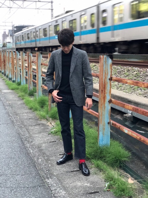 ハリスツイードのジャケットは、グレーをチョイスして、コントラストが絶妙なスタイルに仕上げています。足元にレッドカラーのソックスを差し色として取り入れることで、全体のアクセントになるだけでなくおしゃれさが増しますね。