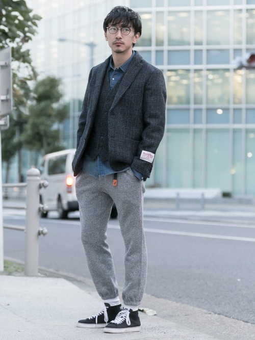 ツイードジャケット×シャツ×ツイードベスト×デニムシャツ×フリースパンツの異素材アイテムを上手に着こなして大人カジュアルに。スウェットのような素材感のフリースパンツを合わせることで、一気に緩やかなニュアンスが加わりますね。