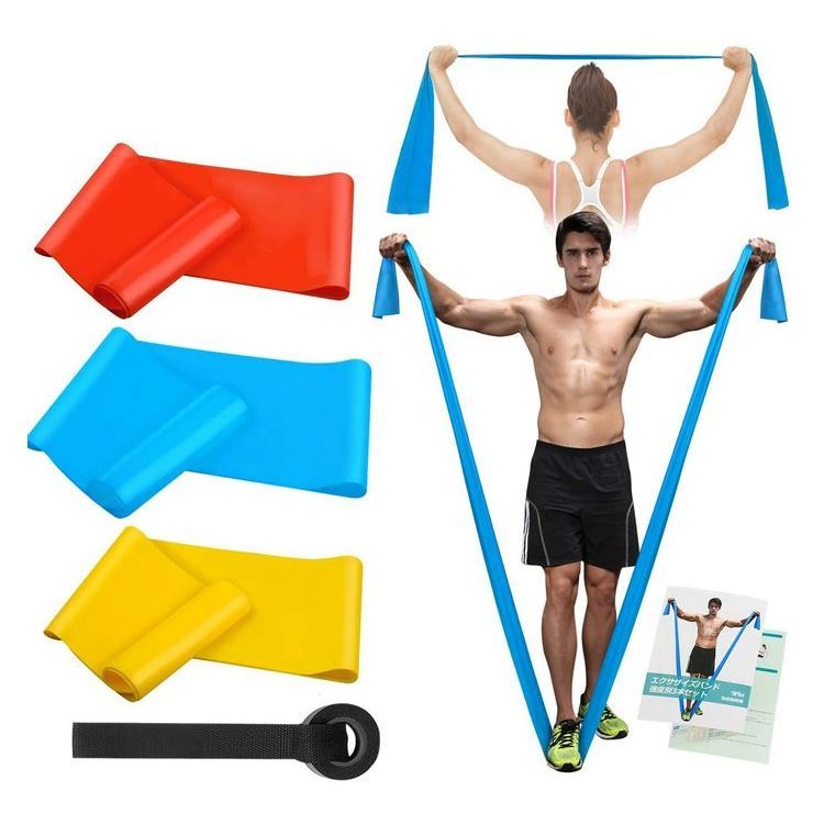 幅が広い形状のチューブです。強度の違うチューブ3本とドアアンカー、日本語の取扱説明書が付いています。耐荷重は8〜10kg、10〜12kg、12〜15kgで、筋トレ初心者から上級者まで使用することが可能です。また、幅広で長さもあるため様々な用途で活用でき、筋トレだけでなく、毎日のストレッチや体力が低下した方のリハビリにも適しています。
