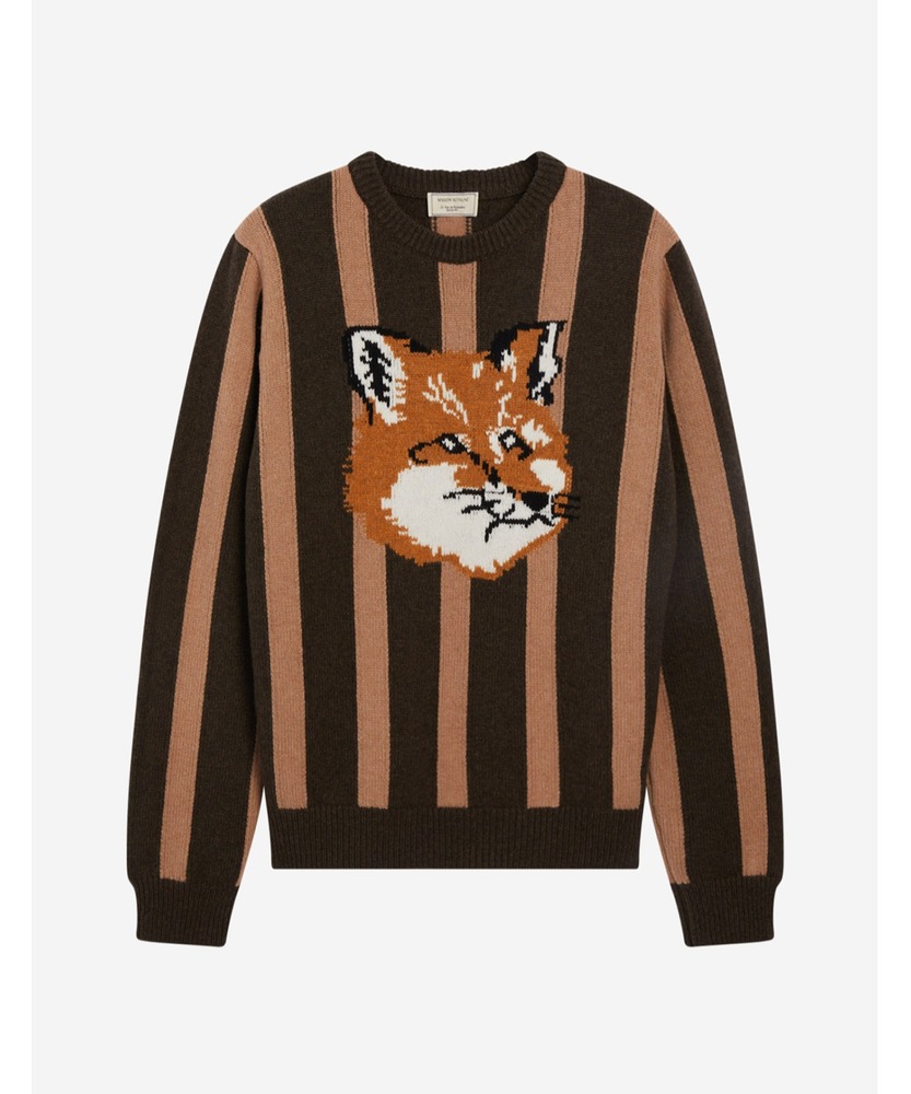 印象的なストライプ柄に「Fox Head」が大きくデザインされたジャカード織の長袖プルオーバーニットです。首元と袖口、裾部分はリブ仕上げで伸縮性を持たせています。シワになりにくく熱を外に逃さないウール素材を採用し、上品なシルエットと遊び心のあるデザインを両立したアイテムです。