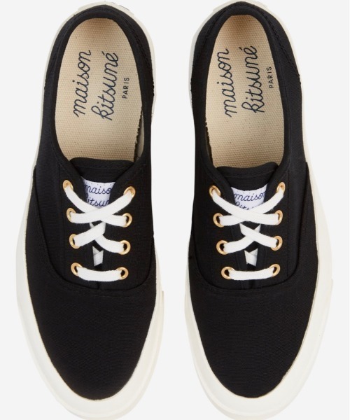 ワイドなラバーソールとコントラストカラーのシューレースが特徴の、オーソドックスなキャンバススニーカーです。ゴールドのシューレースホールがさりげなく上品さをプラスしています。インソール部分とヒールパッチには、「MAISON KITSUNÉ」のロゴを配置。シンプルでどんなスタイリングにも溶け込んでくれる、マストハブな一足です。