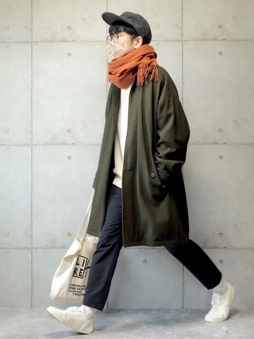 厚みのあるソールで長時間の歩行も疲れにくい、メゾンキツネの白のキャンバススニーカーを着用したメンズコーデです。カーキとオレンジの温かみと品を感じるコーデに、カジュアル過ぎず、きれいめに履けるスニーカーが抜け感をもたらしています。