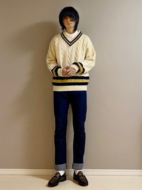 メゾンキツネのきれいなストレートラインのデニムパンツを着用したコーデです。チルデンニット、ローファーを合わせてトラッドな着こなしに。オーバーサイズのニットとタートルネックで、シンプルながらも旬を感じるシルエットに仕上がっています。