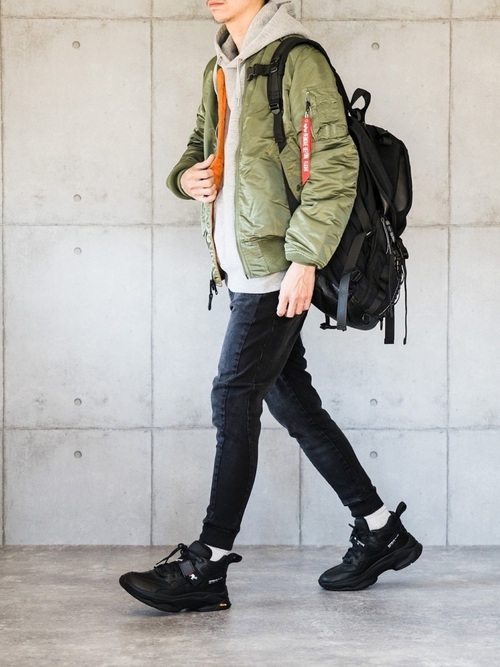 BRANDBLACKとメゾンキツネのコラボスニーカーを使用したストリートMIXスタイルです。MA-1、パーカー、スキニーデニムの定番スタイルに、ハイカットシルエットでベルトを備えたデザインが個性的なスニーカーが存在感を放っています。