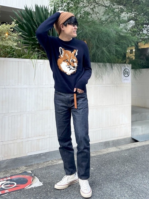 存在感のあるキツネのモチーフが目を引くネイビーのニットと黒のデニムパンツを合わせたカジュアルコーデです。ニットキャップとベルトをブラウンに統一して、足元は白のスニーカーで抜け感をプラス。すっきりとしたシルエットで、シンプルながらも都会的な印象の着こなしになっています。