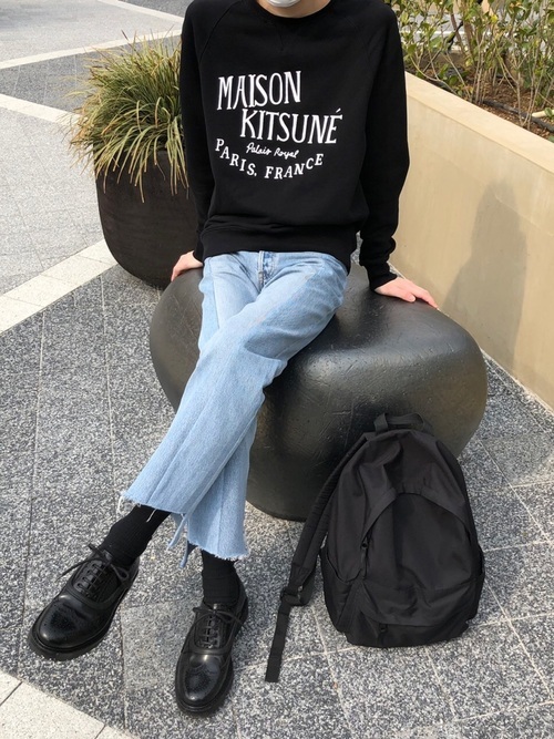 クラシカルな印象の中にも遊び心を感じさせる「MAISON KITSUNE」のロゴが存在感を放つ黒スウェットを使用したメンズコーデです。黒とライトブルーがお互いを引き立て、シンプルながらモダンな着こなしに仕上がっています。
